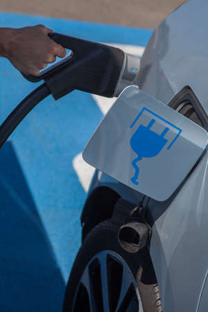 Charging modern electric car battery on the street which are the future of the Automobile, Close up of power supply plugged into an electric car being charged for hybrid . New era of vehicle fuel.