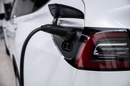 Close-up of an electric vehicle plugged in at a charging station, showcasing sustainable and eco-friendly transportation.
