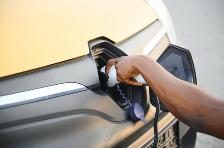 Color image of a man's hand preparing to charge an electric car.