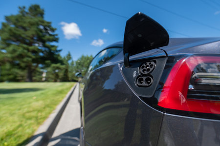 Close-up of a black electric car charging socket outdoors in summer.