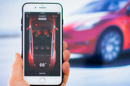Calgary, Alberta, Canada. May 24, 2020. A person using the Tesla application with a car in background