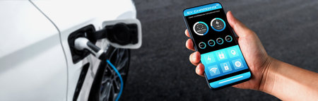 Electric car or ev is charging at station . man use the white power cable and plug on nature background. eco and clean energy concept with the mobile phone smart technology. zero gas and no transmission.