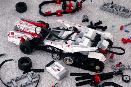 Tambov, Russian Federation - October 31, 2019 LEGO MINDSTORMS EV3 robot on room floor with some bricks and blocks.