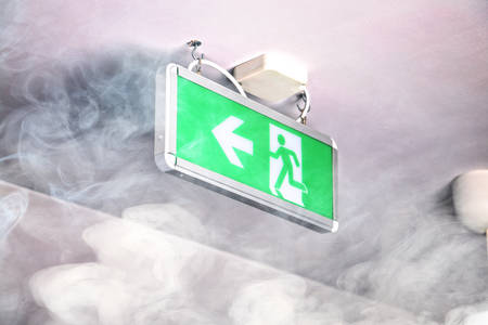Emergency fire exit sign show the way to escape at the public area, warehouse store, For the security first about the being fire concept.