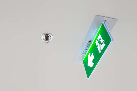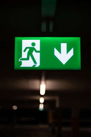 Illuminated green light emergency exit sign in public building for emergency accident and fire case