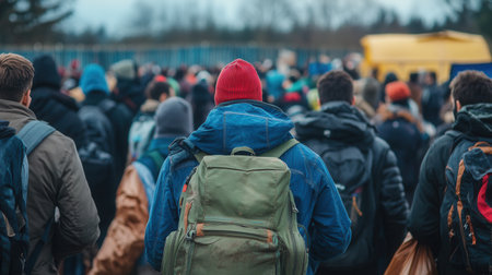 Refugees with backpacks and suitcases gather at a crowded border area, facing challenges and seeking hope for a better future.