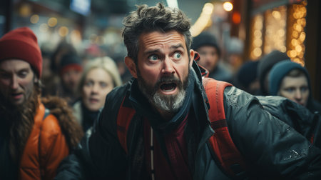 In a crowded location, one person stands out, shouting into their phone, while the surrounding crowd moves in a blur, capturing a moment of urgency.