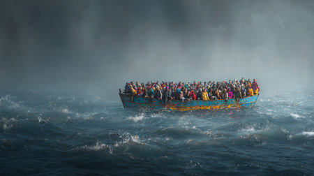 Overcrowded Refugee Boat Navigating Through Open Sea Waters. High quality photo
