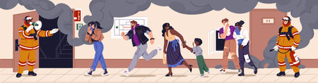 Evacuation from building with smoke, fire security alarm. Firemen with megaphone help people to leaving house in smog. Characters with kids go to exit at emergency situation. Flat vector illustration