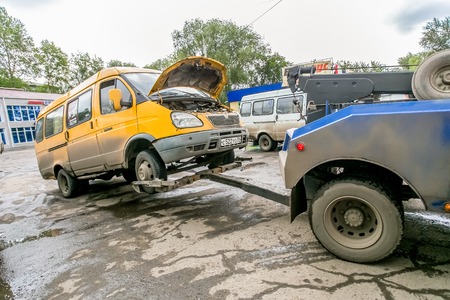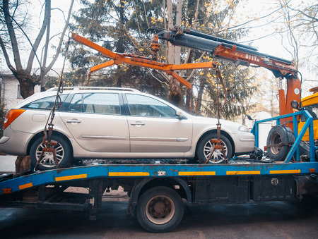 Tow truck for transportation faults and emergency cars on the city street.