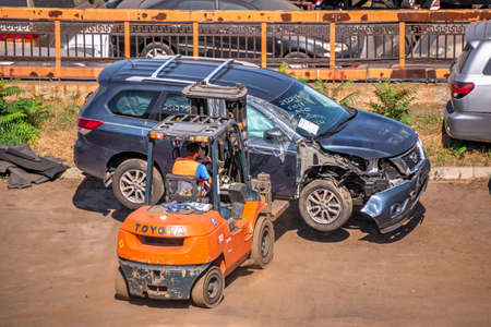 Odessa, Ukraine 09.16.2019.Broken cars for export in the cargo port and container terminal in Odessa, Ukraine, on a sunny day