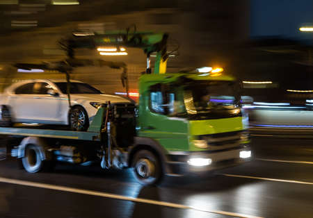transportation of the car on the tow truck in the city at night. Blurred motion