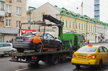 Moscow, Russia, September 30, 2020. A tow truck removes cars of violators on the city street. Moscow.