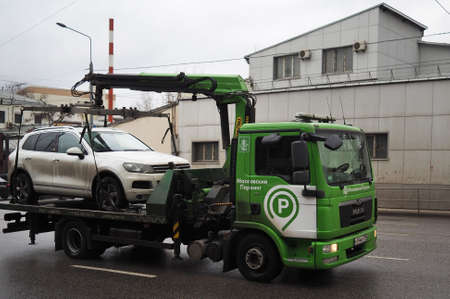 March 10, 2019 Moscow, Russia. A passenger car is taken away by a tow truck due to a violation of Parking rules on a street in Moscow.