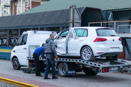 Thessaloniki, Greece - January 18, 2016: Man towing damaged car over a tow truck on the side of the road in Thessaloniki, Greece.