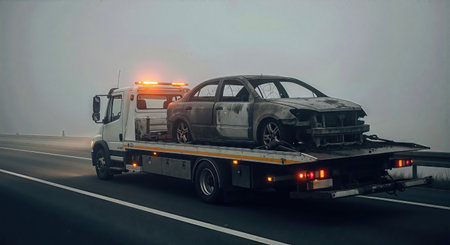 Tow truck on the highway in foggy weather. Concept of road accident