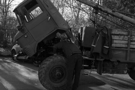 Man repairs a truck by lifting a cab