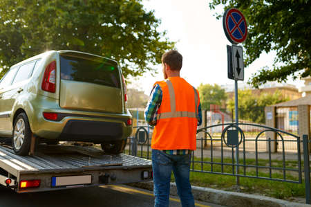 Car evacuation police service by tow truck machine on city downtown street center due parking traffic rules violation. Emergency road assistance service motorway. Automotive trailer carrier transport