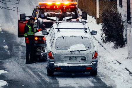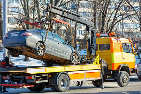 Loading a car onto a tow truck on a city street on a winter sunny day.