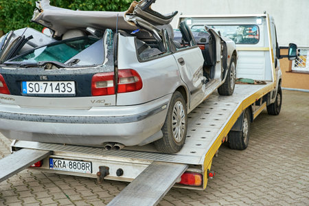 Wrecked car loading on tow truck after crash traffic accident, Concept of dangerous driving after drinking alcohol, Roadside assistance concept. Katy Wroclawskie, Poland - May 28, 2022