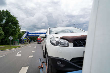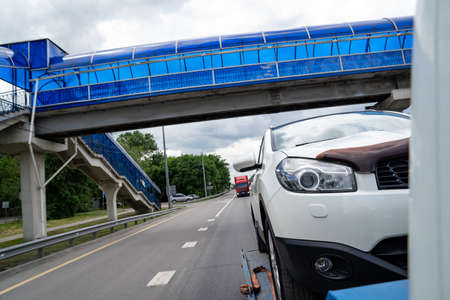 Tow truck with broken car on the road. Transportation concept.