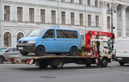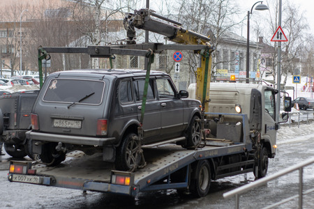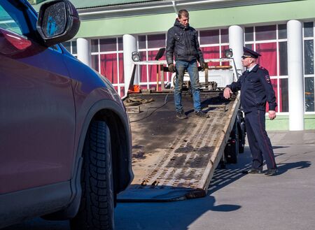 Petrozavodsk, Russia - 20 march 2019. The towing of illegally parked car that have violated local traffic and parking laws
