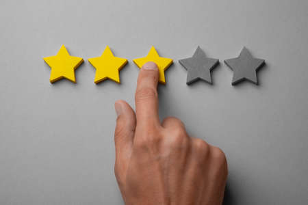 Three golden yellow stars out of five. Man points finger at the star, puts rating, recalls