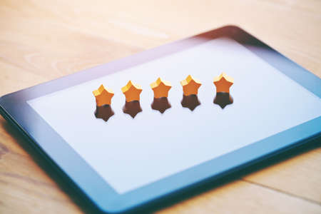 five stars rating symbol as product feedback on tablet computer