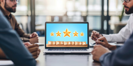 Close up of male hands using laptop and choosing 5 stars on abstract glowing rating interface on blurry background. Customer service, ranking and feedback concept