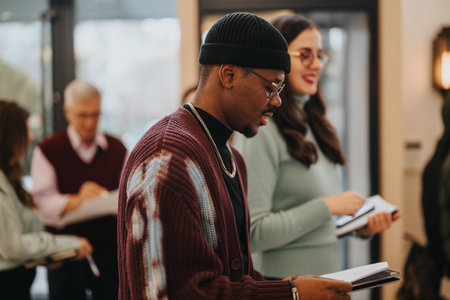 Focused African-American man reading documents with a smiling Caucasian woman in glasses, and people discussing in the background.