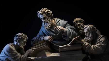 A group of Islamic scholars engaged in a thoughtful discussion, sitting around a table and sharing ideas.. Generative Ai