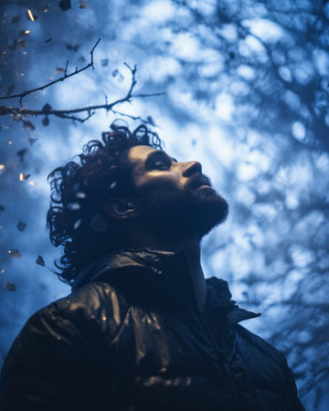 a man standing in the woods looking up at the sky