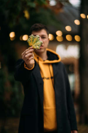 Handsome guy holding autumn leave in the park
