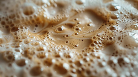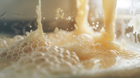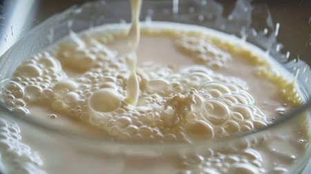 Extreme close-up shot of creamy milk swirling with splashes and airy foam.