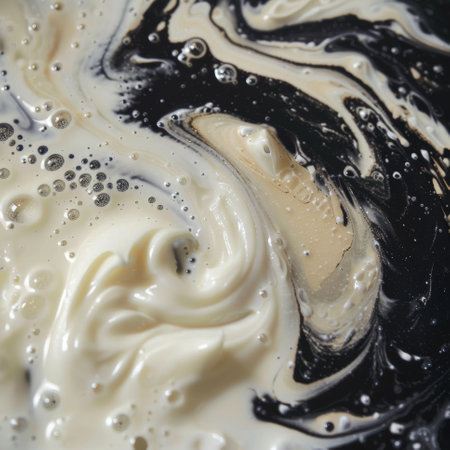 Abstract cream and black liquid marble texture with swirling patterns and bubbles