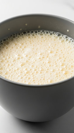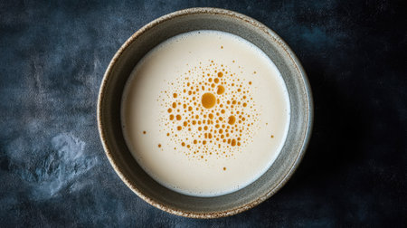 This image features creamy milk with bubbles in a rustic bowl against a dark background, showcasing a unique texture and appealing visual presentation.