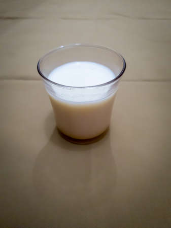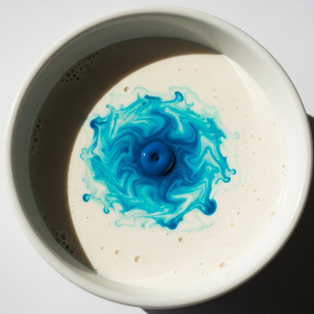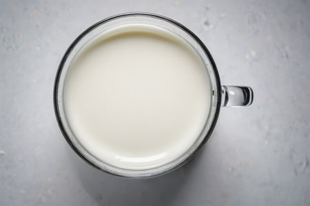 Overhead view of a simple white cup filled with milk, in the shade Cloud Dancer, named color of the year 2026. AI generated.