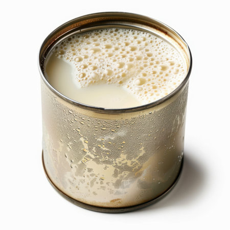 A close-up shot of a tin can filled with creamy liquid, featuring condensation on the surface, ideal for food-related content showcasing dairy or beverage products.