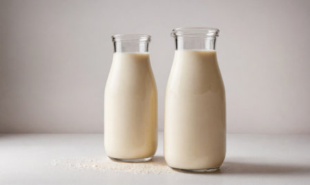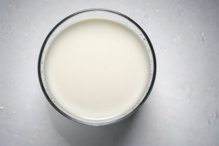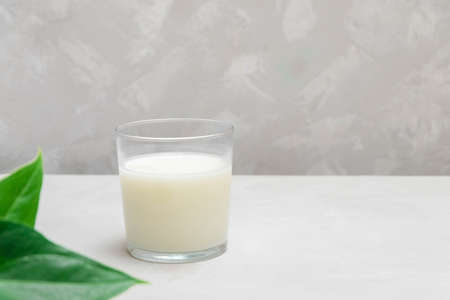 A refreshing glass of milk on a smooth countertop, set against a light, textured backdrop.