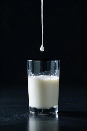 Milk splash pouring into a white cup, stop motion food photography, dramatic lighting, generative AI