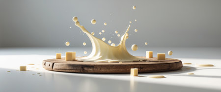 AI Generated. Creamy cheese splashes artfully from a wooden board with cubes and droplets scattered around