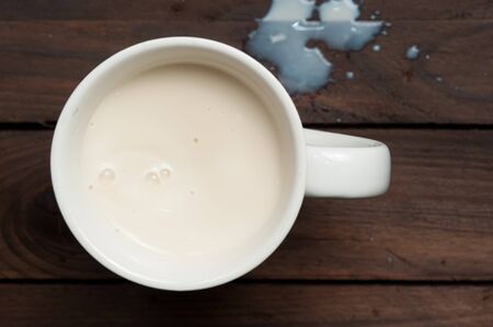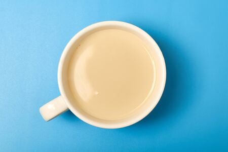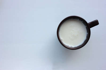 Cup of milk on white background. Brown ceramic mug with fresh milk on table. View from above. Flat lay, copy space. Selective focus
