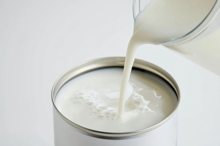Canned milk pouring smoothly into a clean container showing its creamy texture and freshness.