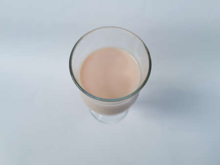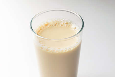 A glass of milk with a white foam on top. The foam is in the shape of a ring