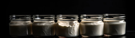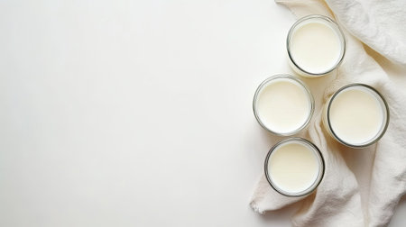 Four jars of creamy dairy sit neatly on a soft cloth against a light background, showcasing a fresh and minimalistic kitchen aesthetic perfect for food inspiration.