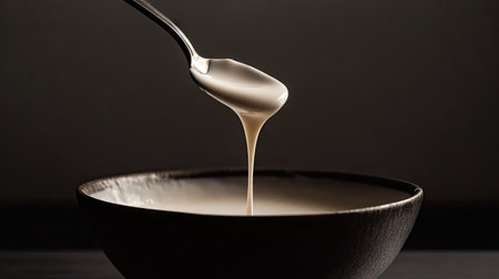 A spoon held above a bowl, lifting a ribbon of condensed milk, showcasing its thick consistency and creamy texture