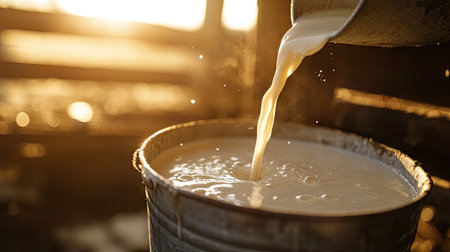 Goat milk flowing into bucket on traditional farm, with sunlight highlighting liquid, representing wholesome dairy and countryside life