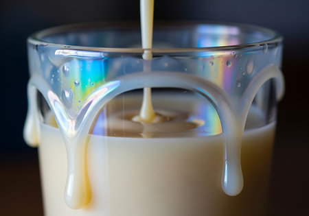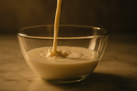 Close-up of fresh milk being poured into a transparent glass bowl, captured with warm cinematic lighting. Smooth texture and gentle ripples create a sense of freshness and simplicity. Ideal for themes of breakfast, nutrition, or dairy products.