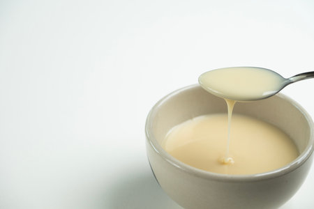 Pouring condensed milk with spoon isolated on white background, food ingredients concept