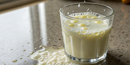 A glass filled with milk sits on a countertop, with some spilling over the edge. The sunlight illuminates the scene, creating a cheerful kitchen atmosphere.
